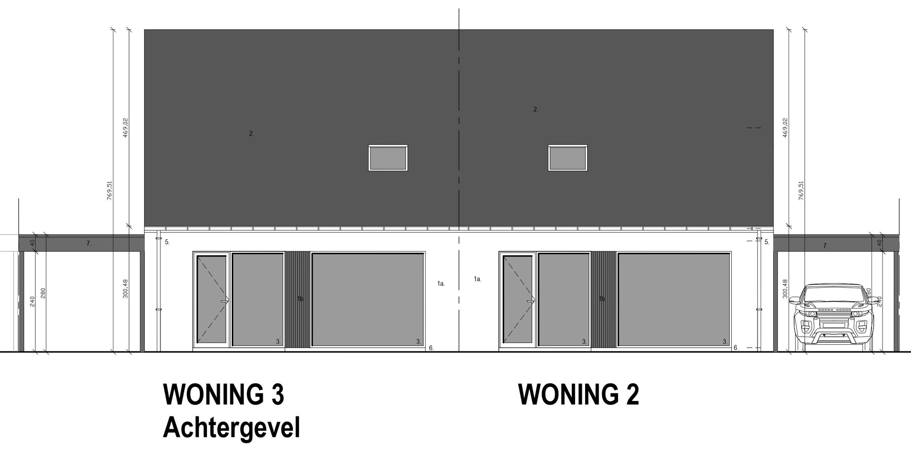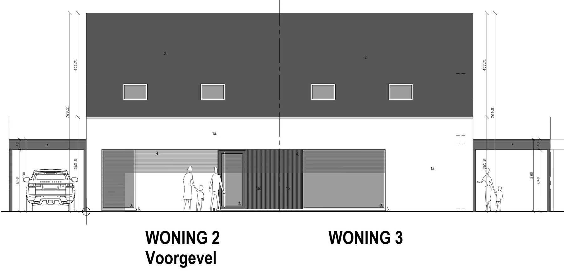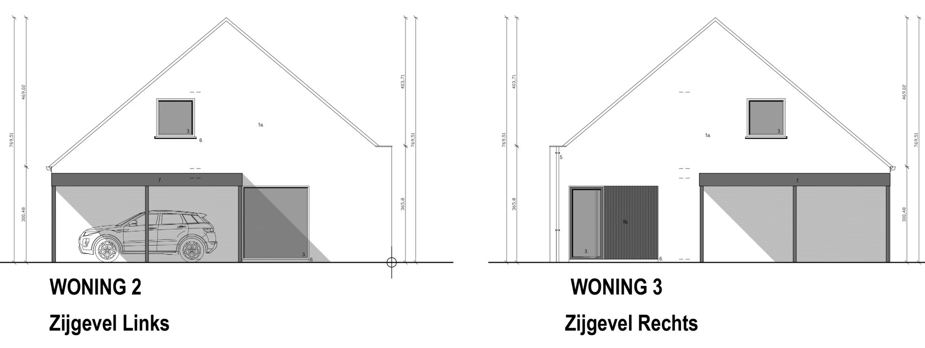 Loten 2 en 3 worden opgericht met 1 bouwlaag + hellend dak en carport.